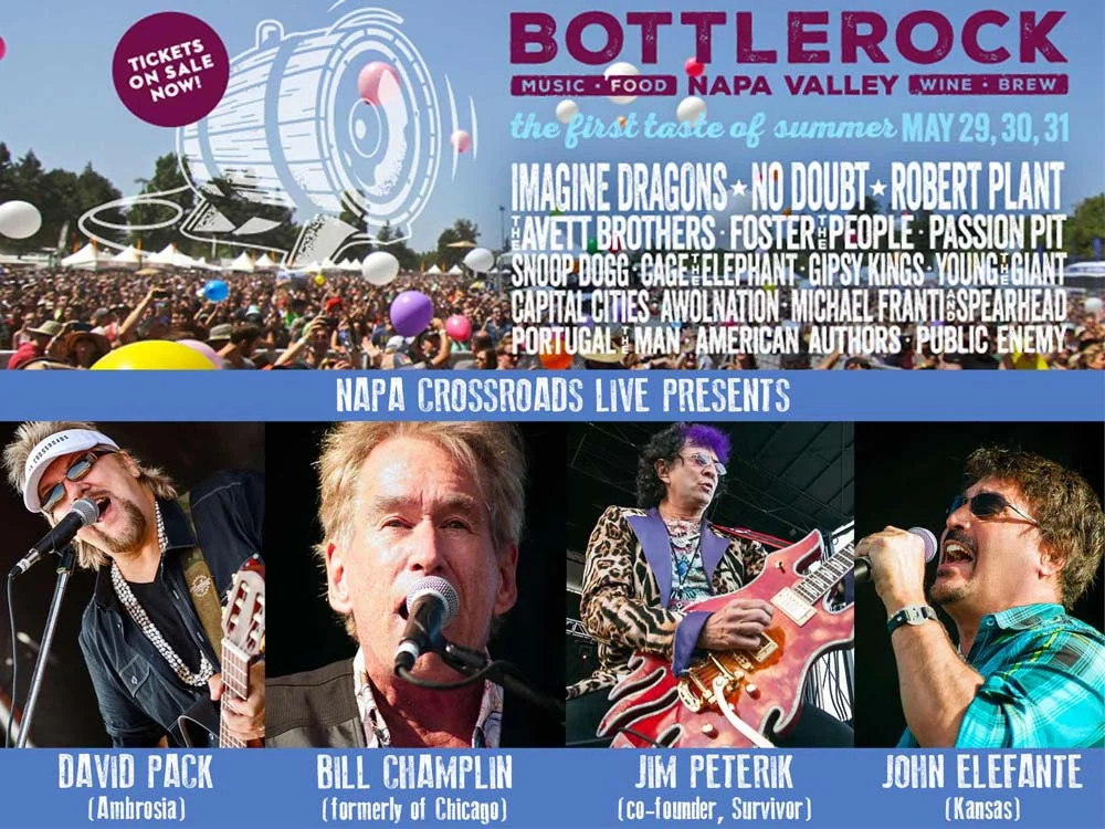 Napa Crossroads Live, our new premiere brand for live concert events, will be represented at this year's BottleRock Festival in Napa, Calif. on Saturday May 30th. David Pack will perform and music direct a super-group that will back co-headliner music legends John Elefante formerly of Kansas, Bill Champlin formerly of Chicago, and Jim Peterik, Co-Founder of Survivor.
